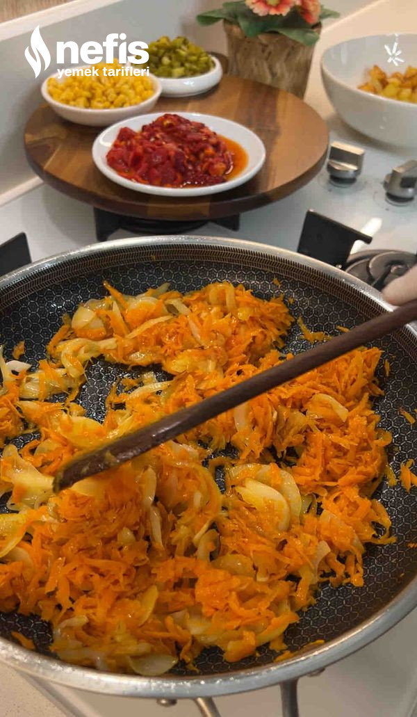 - Soğanları ince doğrayıp az yağda kavurmaya başlayalım. Havuçları rendelenip soğanlara ek edelim. Yumuşayana kadar kavuralım. Servis tabağına alalım.