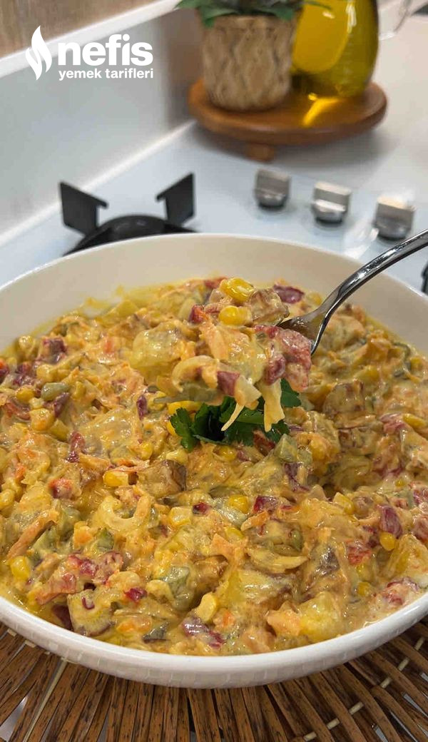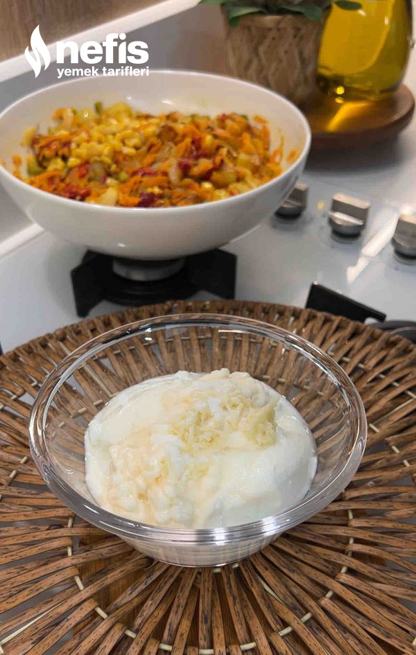 - Yoğurt, mayonez sarımsak rendesi ve tuzu karıştırıp salataya ek edelim. Güzelce karıştırıp servis edelim. Afiyet olsun.