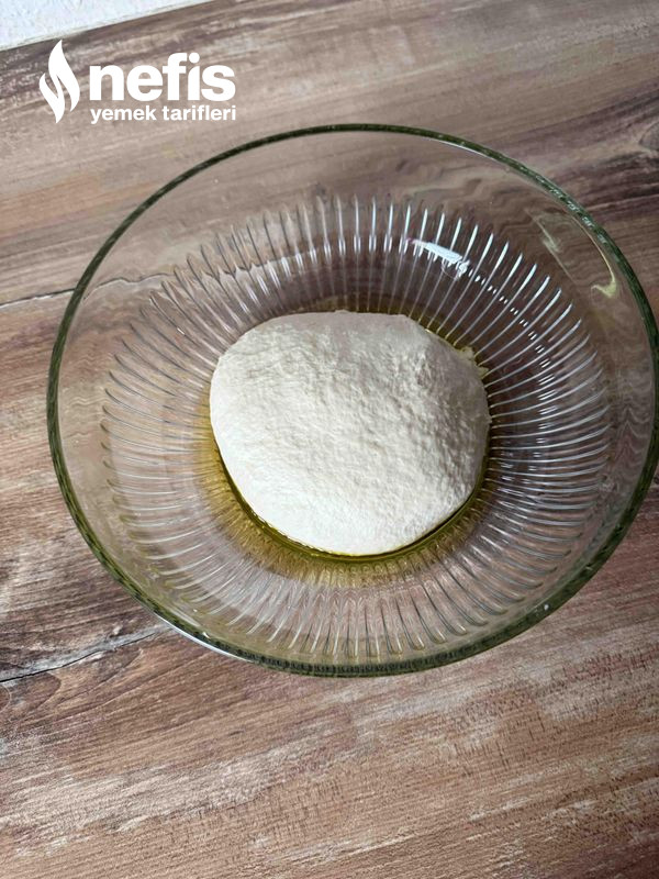 - Temiz bir kabın içine 1 yemek kaşığı zeytinyağı ekleyip toparladığınız hamuru içine alın. Kabınızı streç folyo ile sıkıca örtün ve hamuru bu biçimde 1 saat mayalandırın.