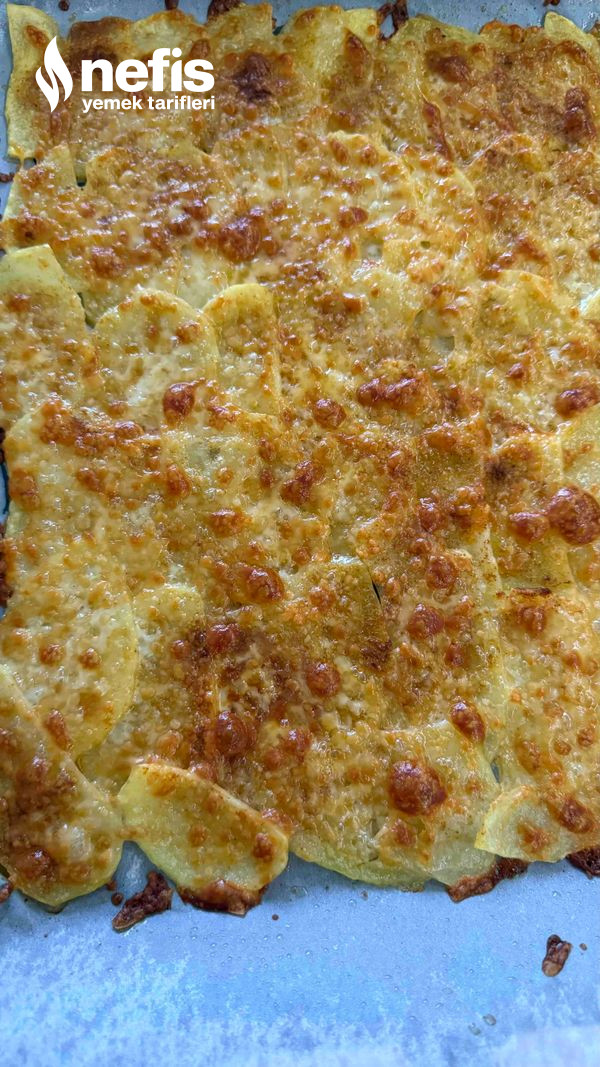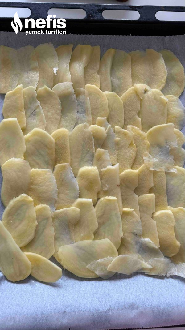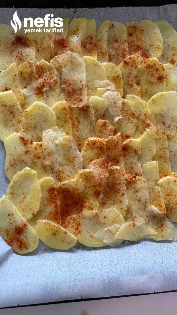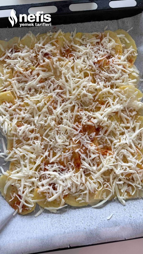 - Salça, tuz ve biberleri ekleyip karıştırarak 5 dakika pişirin, ocaktan alın patatesleri ince ince kesip tepsiye dizin.