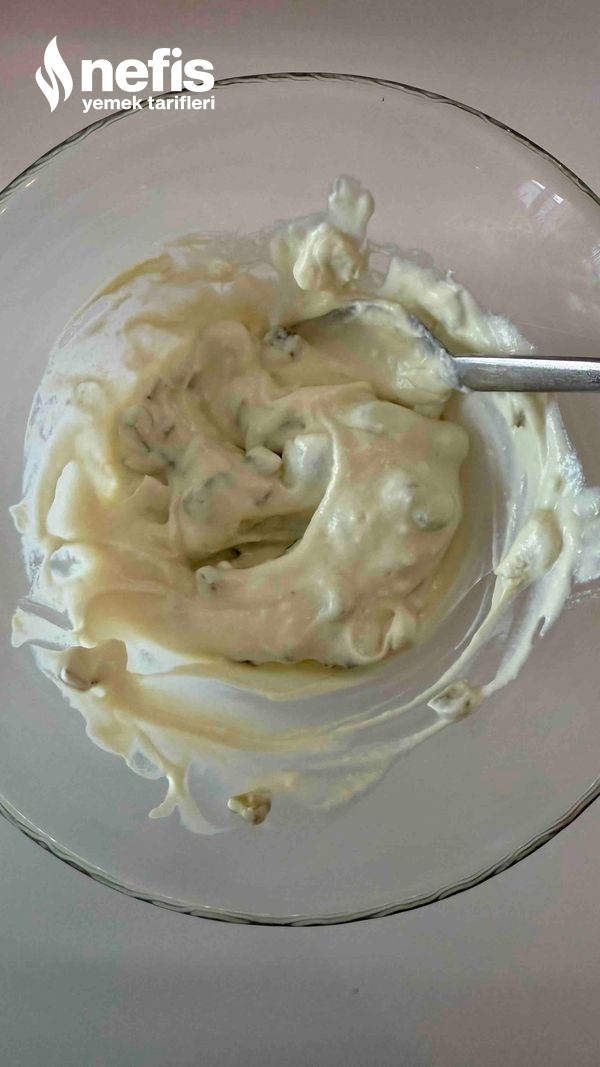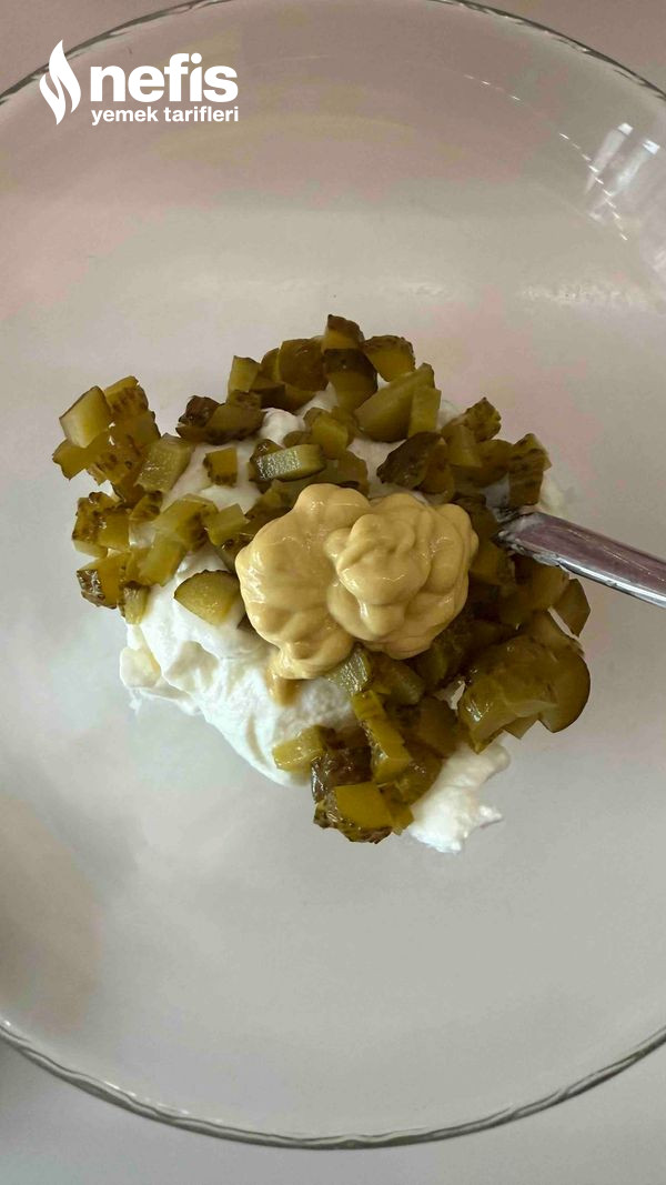- Sos için : bir kasede küçük kesilmiş turşu, yoğurt ve hardalı karıştırın.