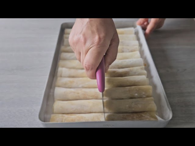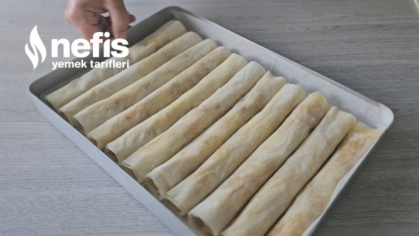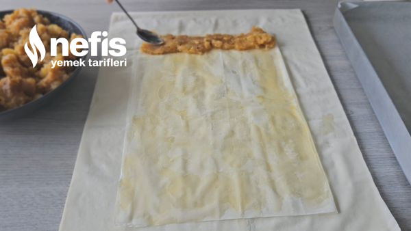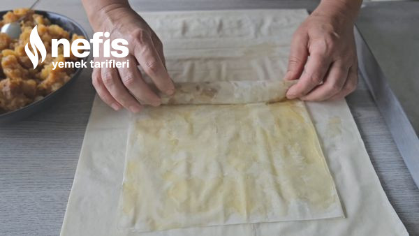 - Tekrar yağ sürülür ,yufkanın dar tarafına,iç materyal yerleştirilir.