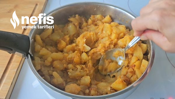 - Pişen patates çatalla ezilir ,soğuması için kenara alınır.