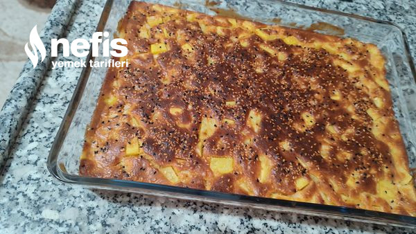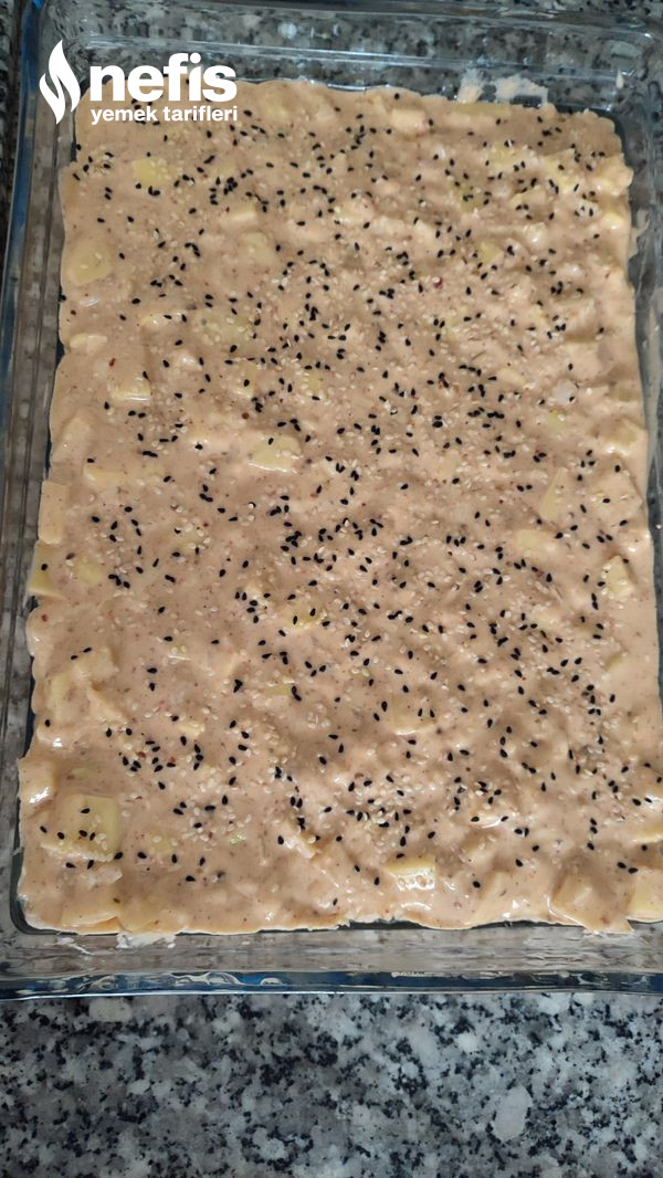 - Yağlanmış kare borcama çörek harcımızı eşit bi halde dökelim ve üzerine susam yada çörekotu serpelim.