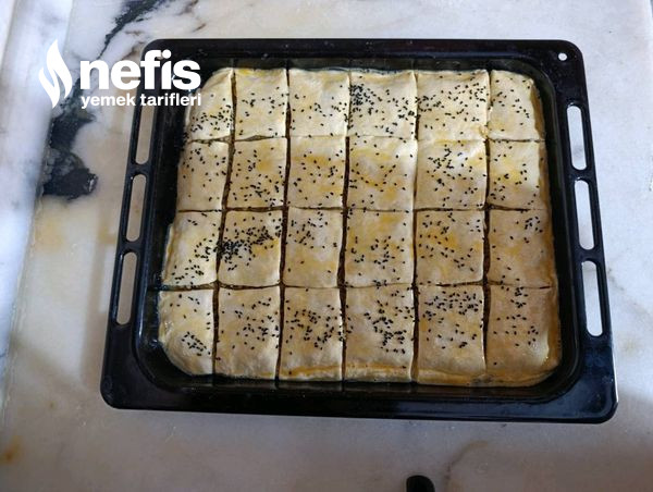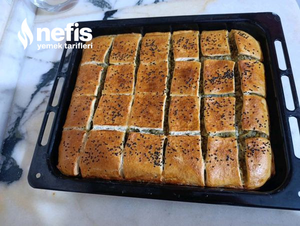 - Ayırdığımız başka yumağımızı da açalım. Tepsimize alım ve kenar kısımlarını elimizle bastıralım. Böreğimizi dilimleyelim üzerine 1 yumurta sürelim. Üzerine çörek otu serpelim.