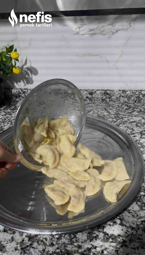 - Ay biçiminde kapatalım, kaynayan suya biraz tuz atalım mantıları da ekleyip haşlayalım pişen mantılara bir ölçü soğuk su ekleyip şoklayalım.