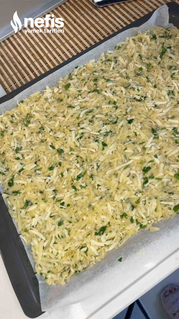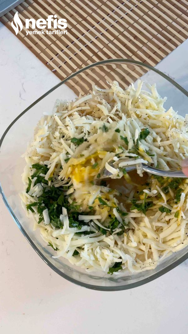 2. Patatesleri rendeleyelim ve yeterlice suyu süzülene kadar elimizle sıkalım. Akabinde geniş bir kaba tüm gereçleri ekleyip harmanlayalım.
