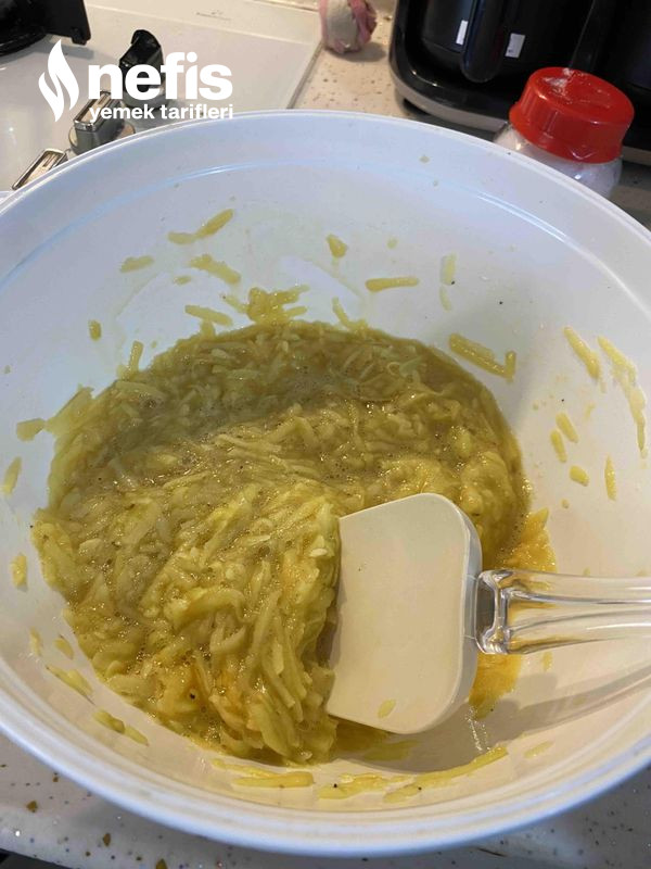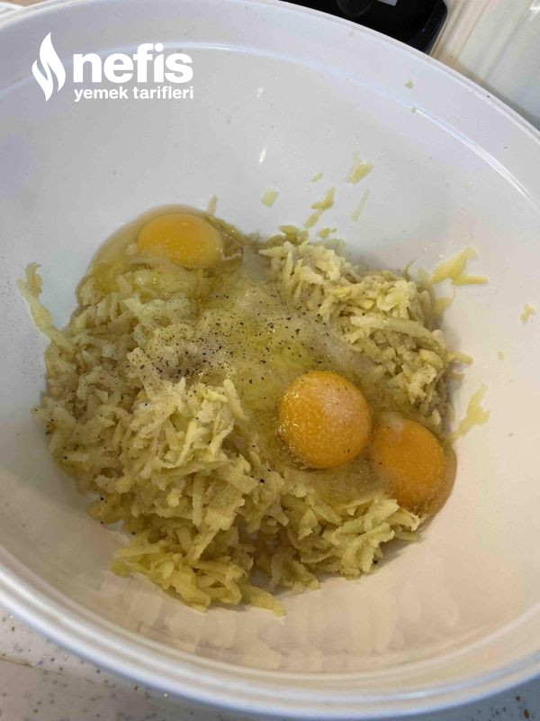 - Rendelenen patatesin içerisine 3 yumurtayı tuzu ve karabiberi ekleyip düzgünce karıştıralım.