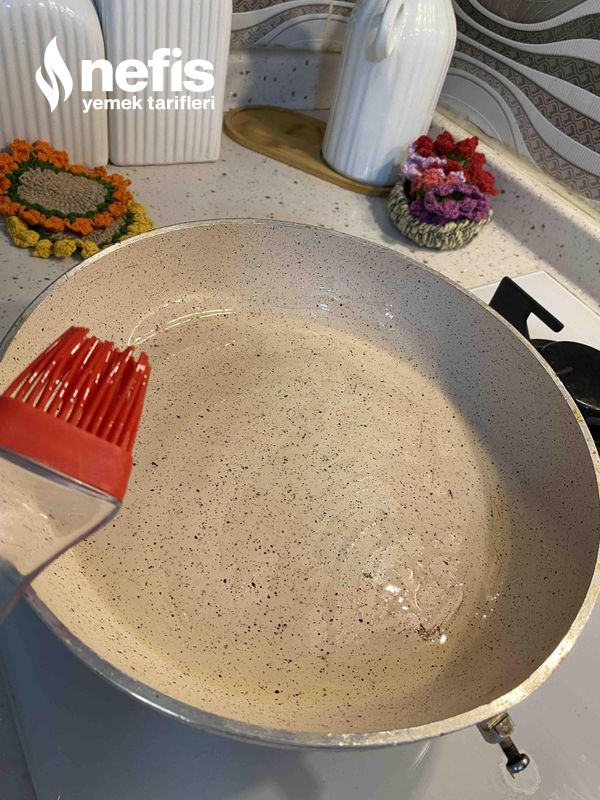 - Pişen omletimizi çevirelim 1 yemek kaşığı yağı koyup, fırça yardımı ile sürelim ve çevirdiğimiz omleti koyup, pişmeye bırakalım.