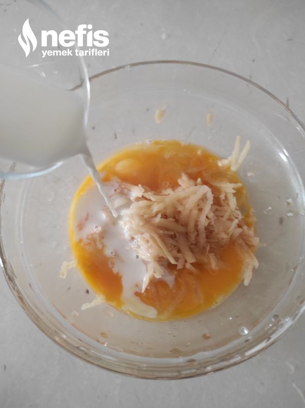 - Patatesi rendeleyip suyunu sıkarak bir kasede yumurta ve sütle birlikte çırpıyoruz.