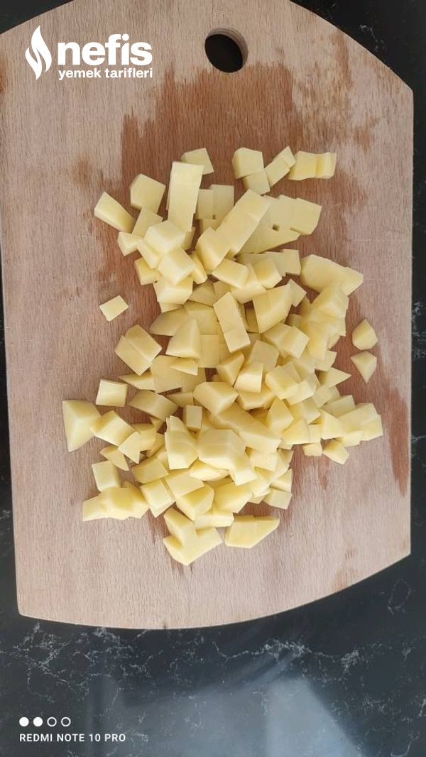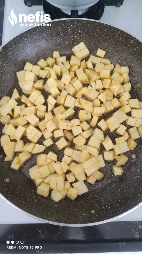 2. Daha sonra patatesleri küçük küp küp doğrayıp kızgın yağda olağan patates kızartır üzere kızartalım.