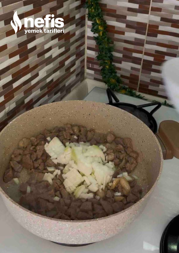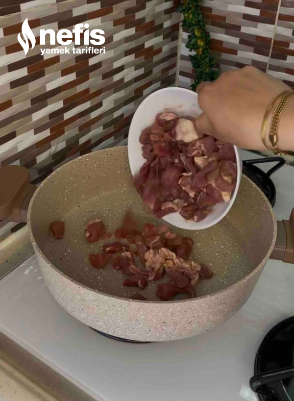 1. Tenceremizi ocağa alarak ısıtalım. Daha sonra kuşbaşı etleri ek edelim ve tencerenin kapağını kapatalım. Etler suyunu salıp tekrar çekene kadar ortada karıştırarak pişirelim.