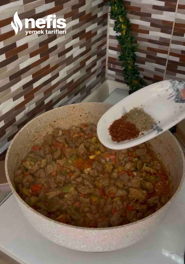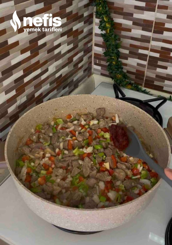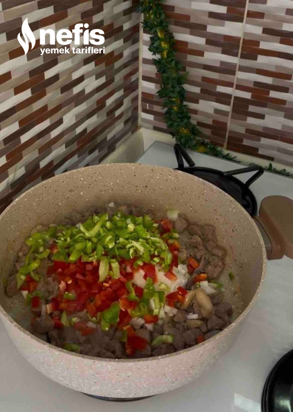 2. Suyunu çeken etlere 3-4 yemek kaşığı sıvı yağ, doğramış olduğumuz biberler, kuru soğan ve biber salçasını ek ederek karıştıralım.