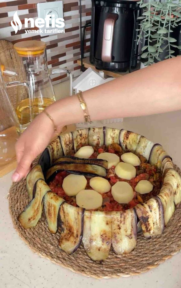 10. Son olarak bir sıra daha patates dilimi yerleştirerek patlıcanları üzerine kapatalım.