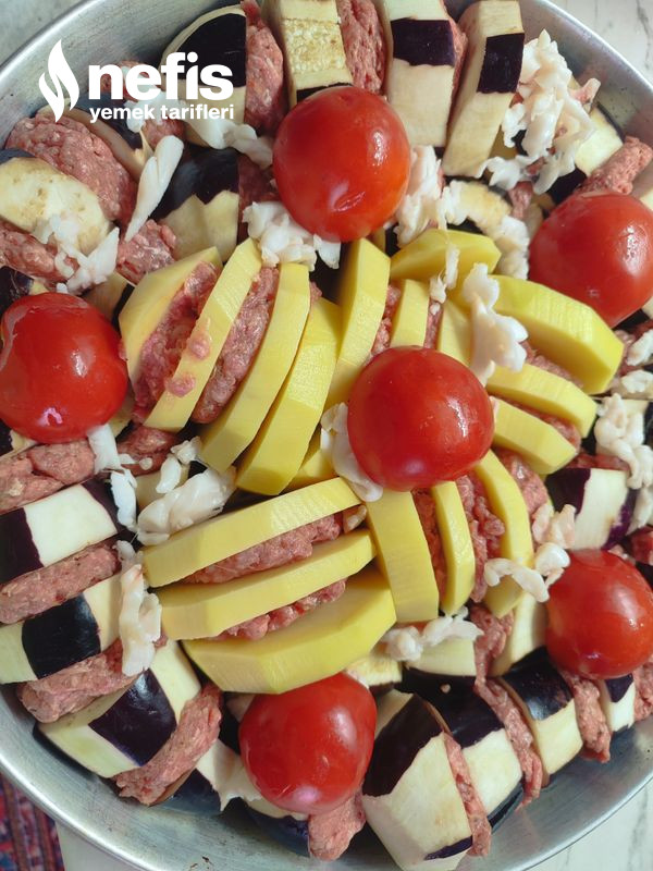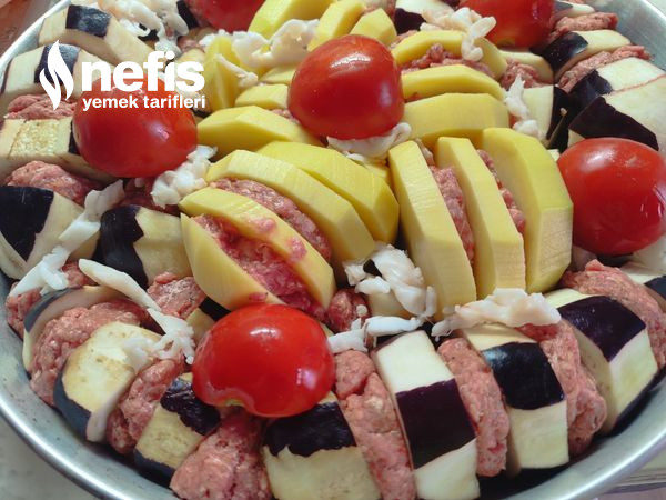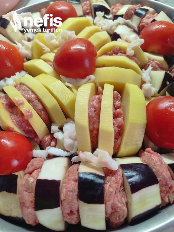 2. 1 dilim patlıcan bir top kıyma yaparak tepsiye dizelim. Üzerine domatesleri dilimleyip koyalım. İsteyen benim üzere üzerine kuyruk yağı da dilimleyip koyalir. Lezzeti artırıyor zira.