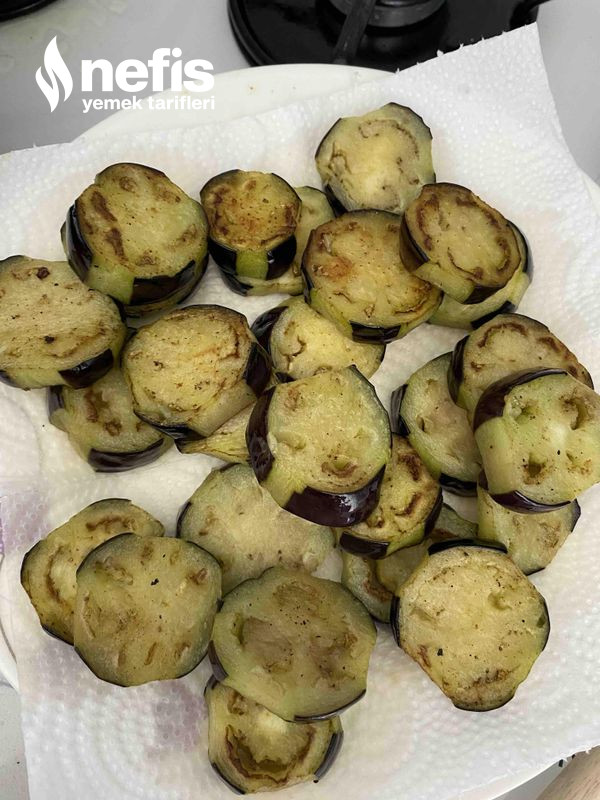 4. Kızaran patlıcanları kağıt havlu serdiğimiz bir tabağa alarak fazla yağının süzülmesini sağlayalım.