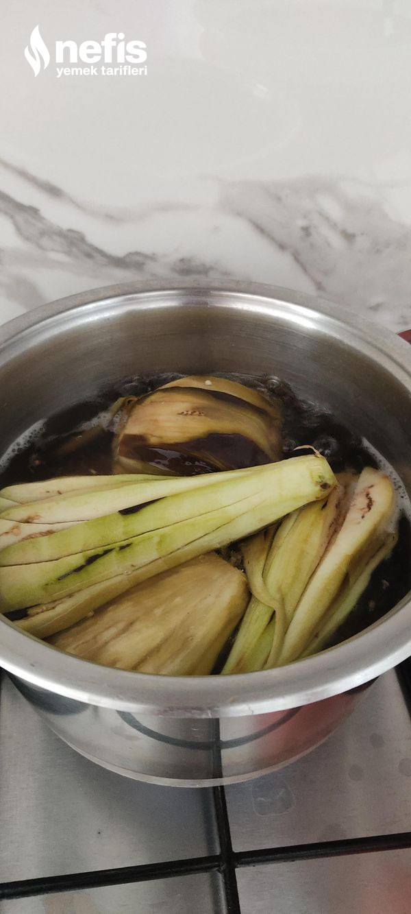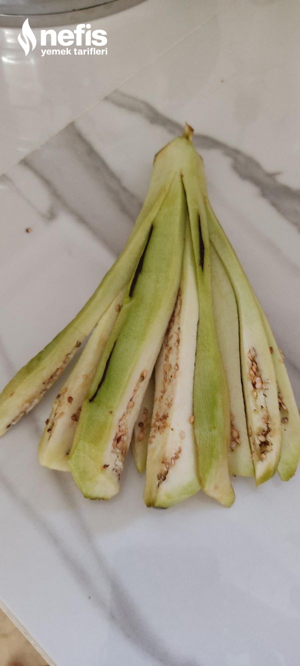 - Soyulan patlıcanları taban kısmından ayirmadan 3 eşite bölelim.