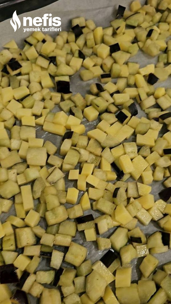 1. Patlıcanları yıkayıp kurutun,alacalı soyun minik küpler halinde doğrayın.