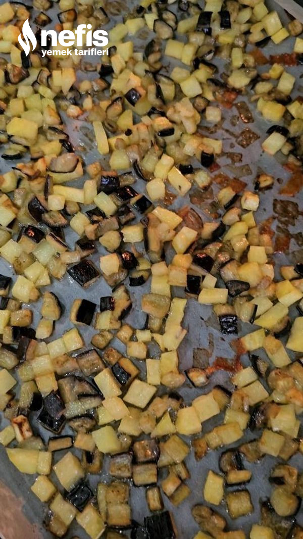 5. Daha sonra pişen patlıcan,patatesi ekleyin,servis tabağına alın,cevizleri düzgünce doğrayın biraz sıvı yağda kavurun.