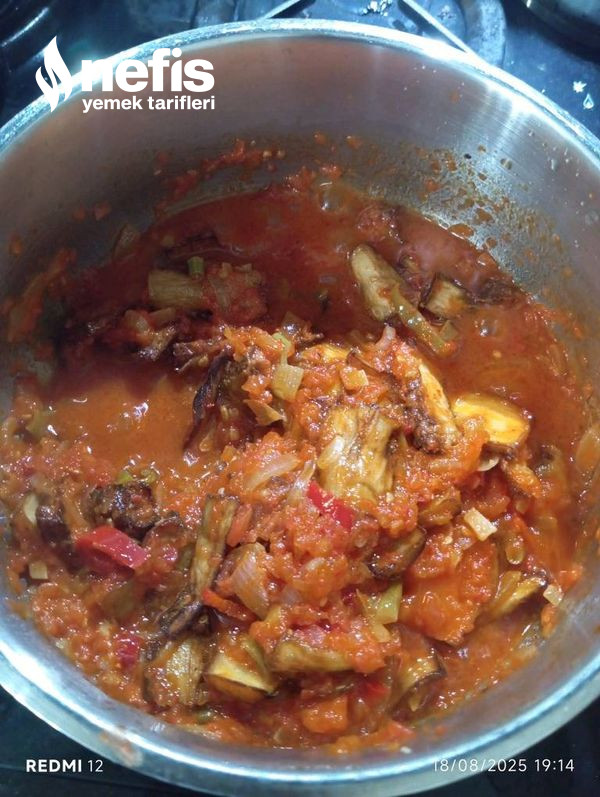 - Patlıcanları da ekleyip, baharatlar atılarak, ağzı kapatılır ve 5 dakika kısık ateşte sosla pişirilir.