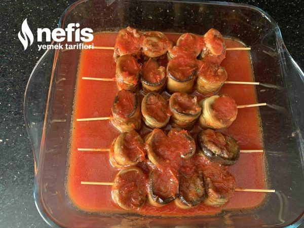- Patlıcanlarımızın içerisine bu harçtan koyup rulo formunda sararak çöp şişle dilediğiniz ölçüde sabitleyip fırın kabımıza alalım.