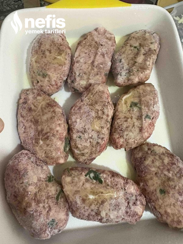 - Bu sırada köftelerimizi de fırın kabına alıp yağlayarak patlıcanların yanına fırına pişmeye koyalım.