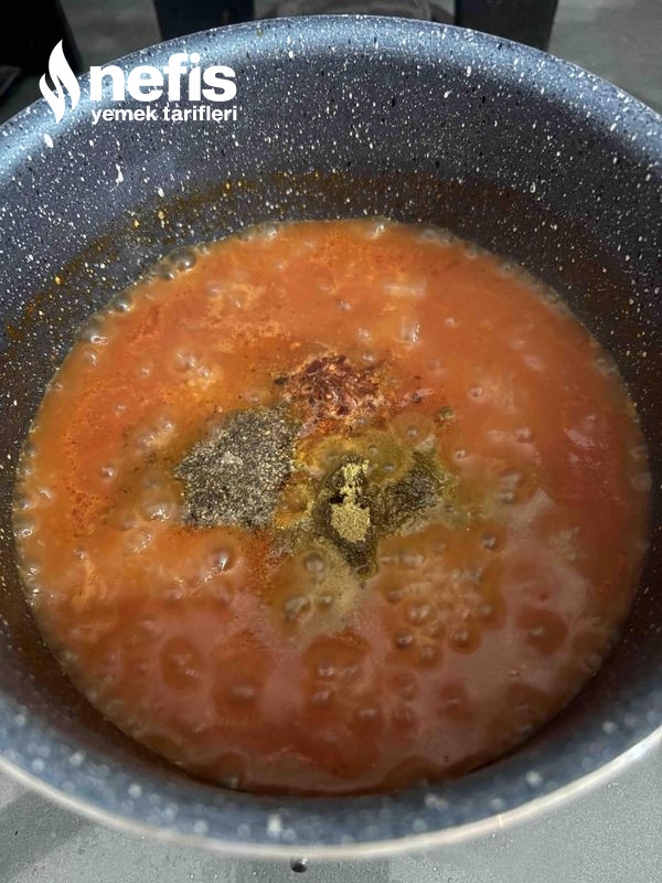 - Bir tavaya rendelediğimiz domatesi alalım 2-3 yemek kaşığı zeytinyağ ile pişirelim ve baharatları ekleyelim ocağın altını kapatalım.