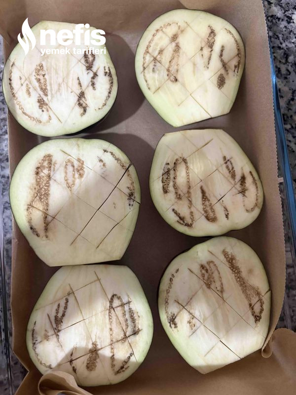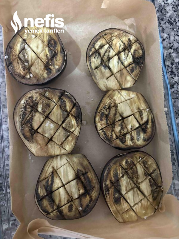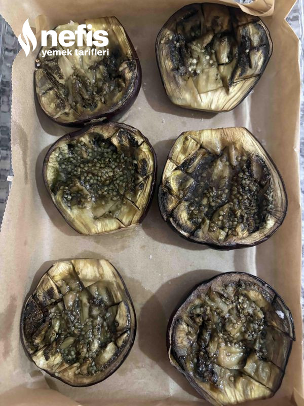 - Patlıcanları sudan çıkarıp peçeteyle kuruladıktan sonra fırın tepsisine dizelim üzerlerini fırçayla yağlayalım ve 180 derece fırında pişirelim.