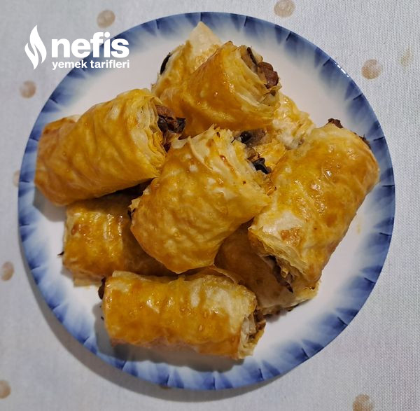 - Her yufkanın kenarına şerit halinde uzunlamasına iç harcı koyup çok sıkı ya da çok gevşek olmayacak biçimde rulo halinde saralım.