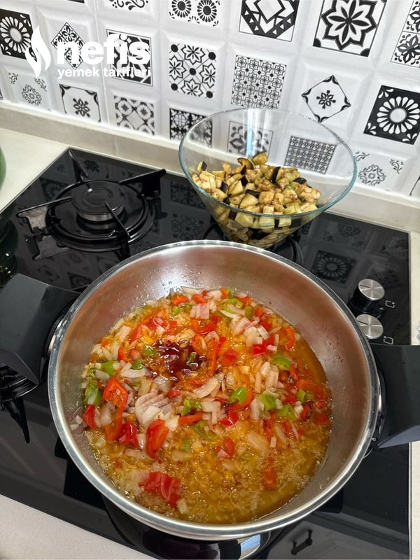 2. Daha sonra tencerenin içerisinde soğanı ,yeşil biberi ve salçasını alarak kavuralım, patlıcanları elimizle uygunca suyunu sıkarak tencerenin içerisine alalım, ortalama 20 dk pişirelim.