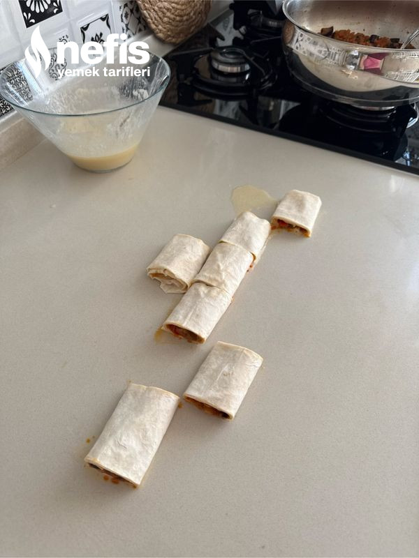 5. Yufkanın kenar kısımlarını katlayalım, katladığımız kısma hazırladığımız iç harcımızı yerleştirerek çok sıkı olmadan rulo haline getirelim.