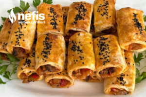 5. Yufkanın kenar kısımlarını katlayalım, katladığımız kısma hazırladığımız iç harcımızı yerleştirerek çok sıkı olmadan rulo haline getirelim.