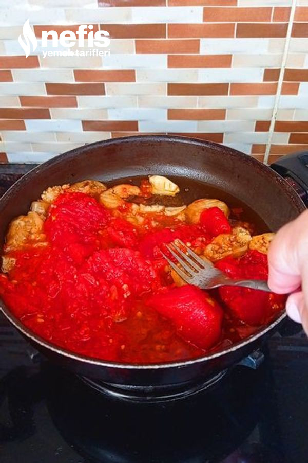 - Daha sonra domatesleri ve sarımsağı da ekleyip orta ateşte pişirelim ve tavanın kapağını kapatalım.