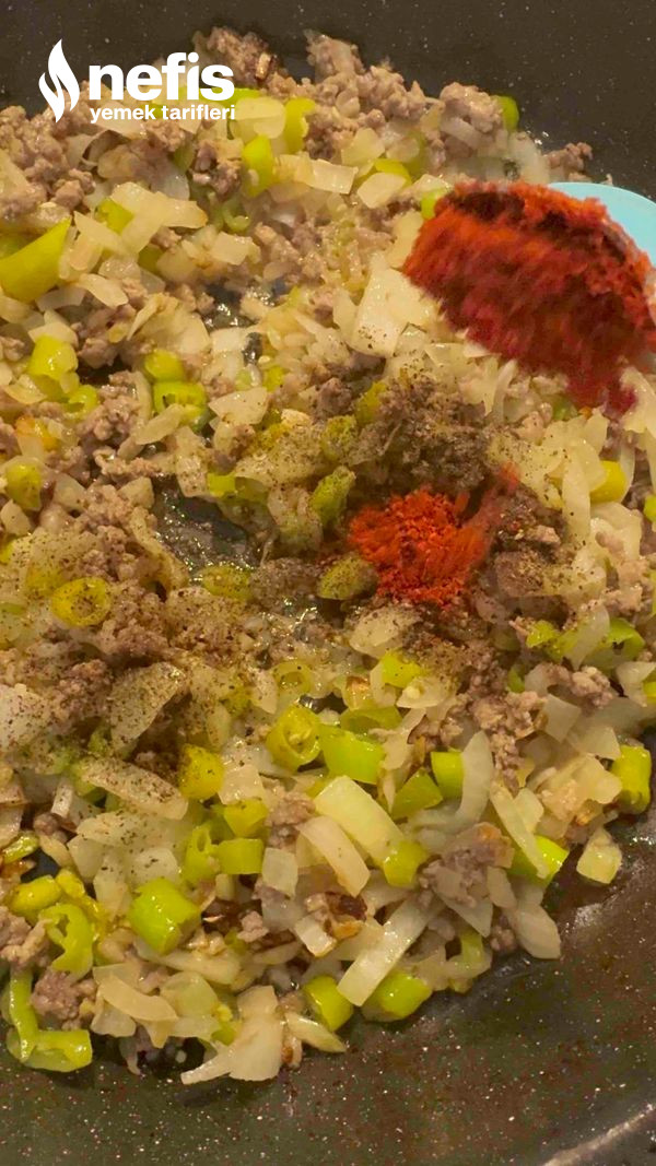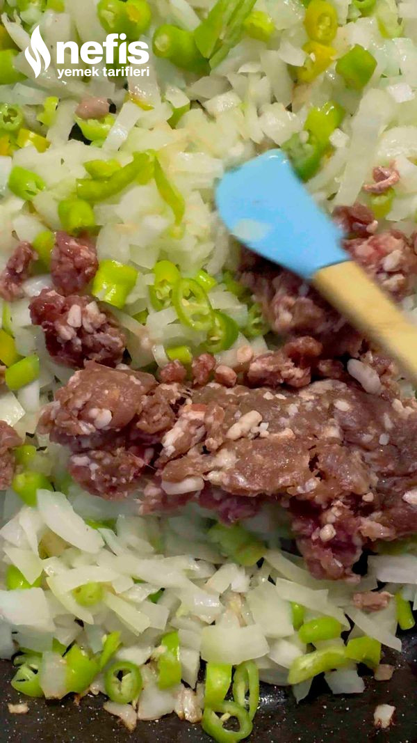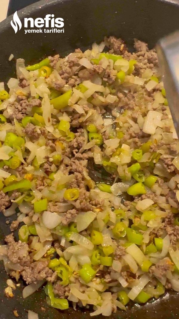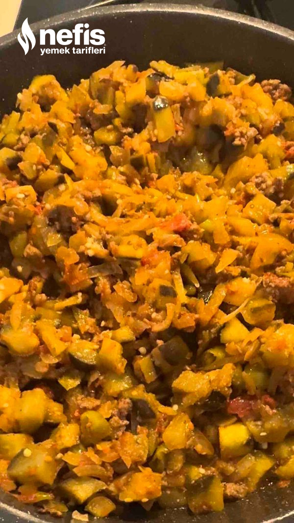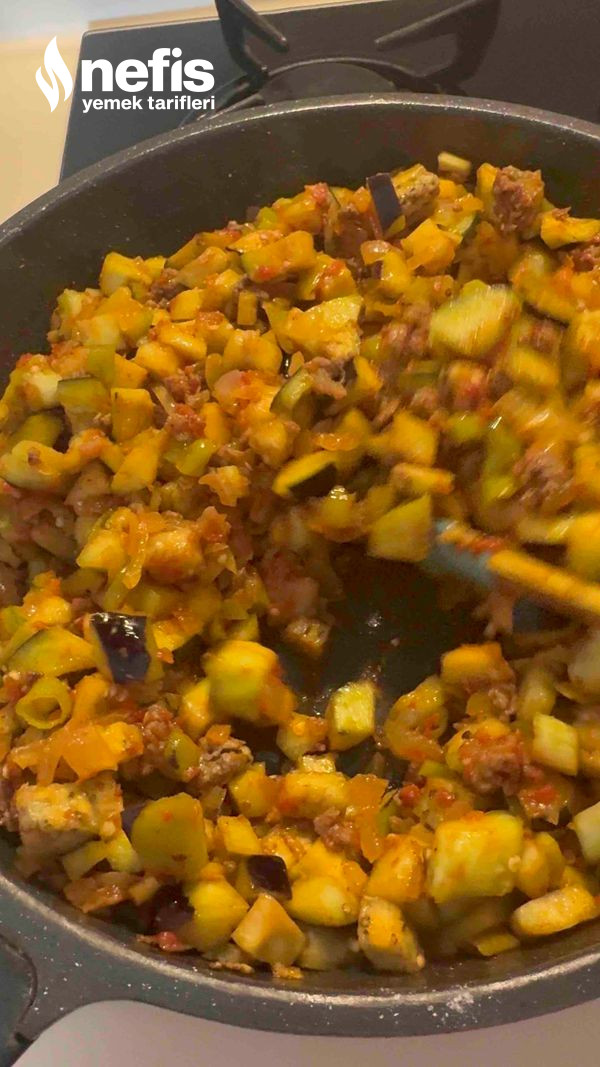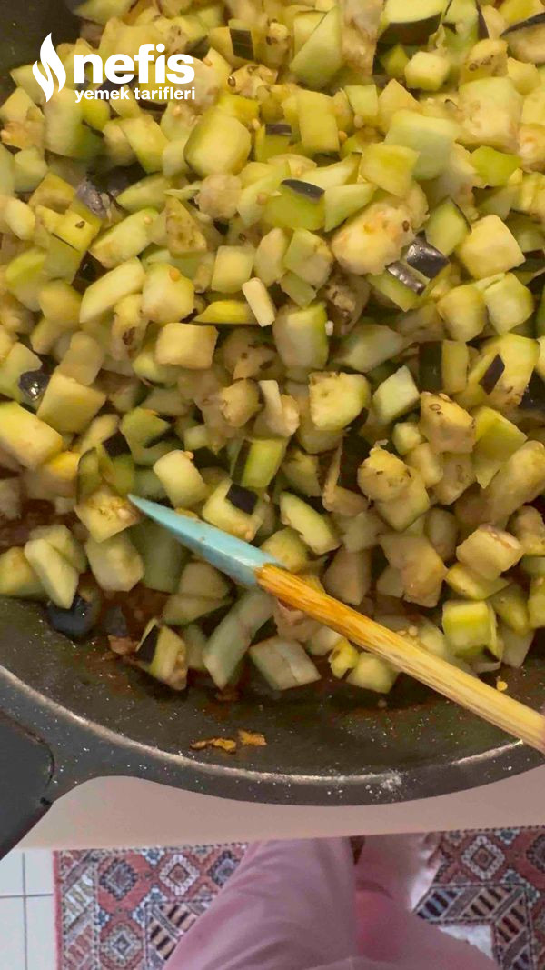 - Tereyağı ve zeytinyağının içerisinde soğanlar biberler ve kıyma sotelenir, üzerine doğranmış domates ya da rende domates eklenir en son suyu uygunca sıkılmış olan patlıcanlar eklenir, 5 dakika daha sotelenir altı kapatılır, dinlenmeye bırakılır. Tuzunu kavurma esnasında ekleyebilirsiniz.