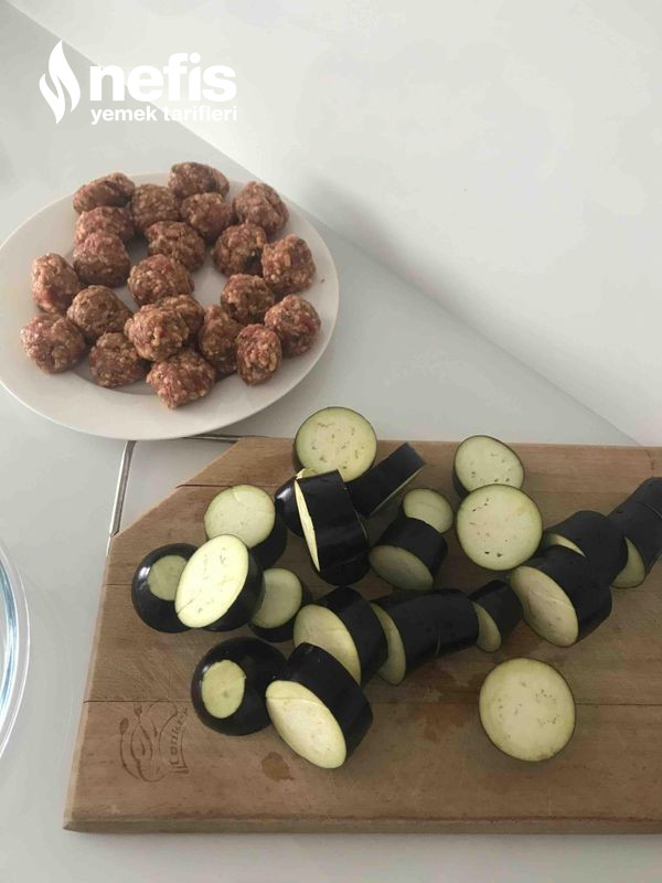 3. Patlıcan köfte biçiminde fırın kabına dizdim.