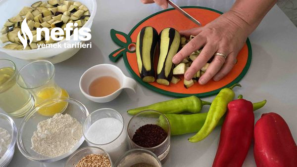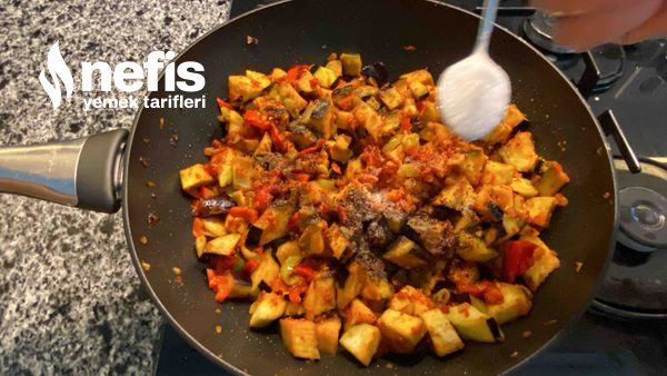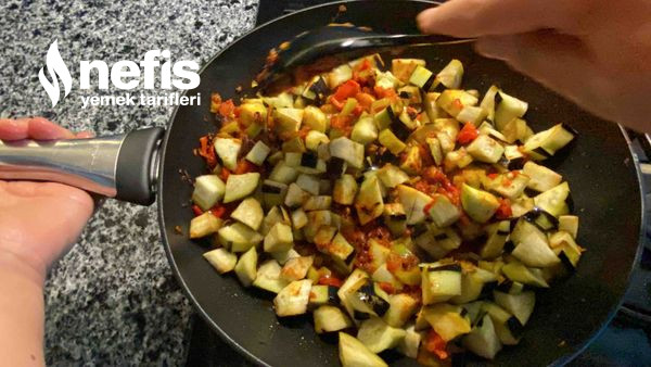 - Patlıcanları alacalı soyup küçük küpler halinde doğrayın, acısının çıkması için tuzlu suda bekletip süzün.