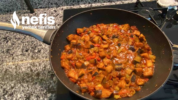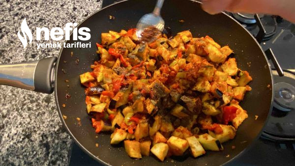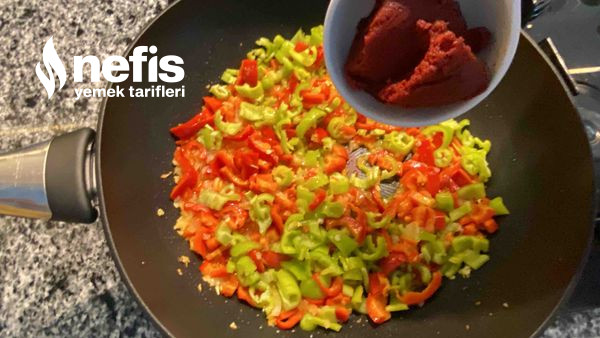 - Kapya ve yeşil biberleri ekleyip kavurmaya devam edelim patlıcanları ekleyip, yumuşayana kadar pişirelim.