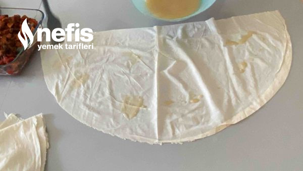 - İlk yufkayı tezgaha serip, ortadan ikiye bölelim üzerine hazırladığımız sostan sürelim. Yufkanın geniş kenarına iç harçtan koyup rulo biçiminde sarıp kendi etrafında döndürerek saralım.