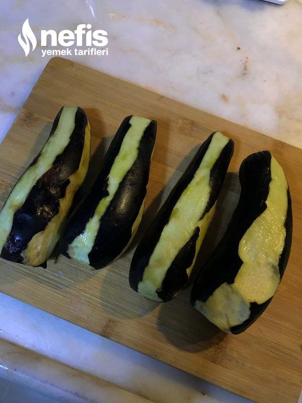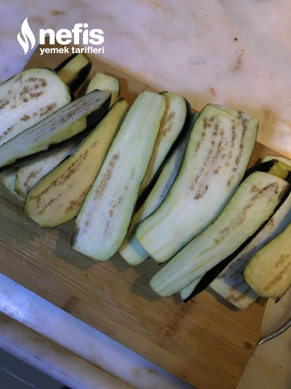 - Patlıcanları alacalı soyalım sonra uzunlamasına keselim patlıcanın büyüklüğüne nazaran yaklaşık 4 şerit çıkıyor sonra tavada tek tek kızartalım yumuşasın kâfi.