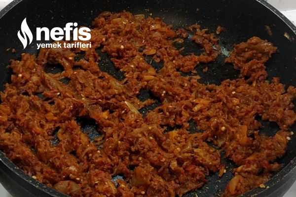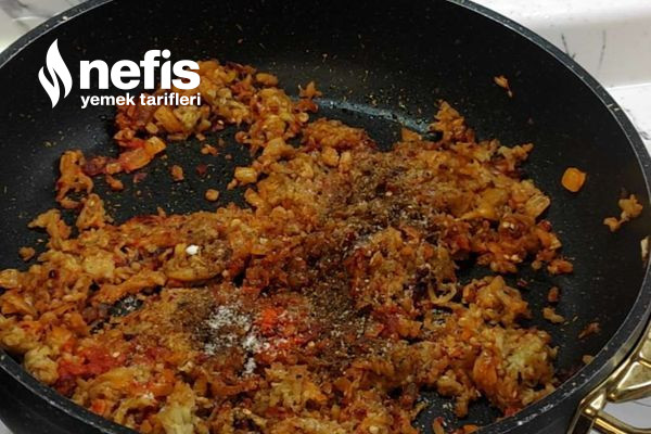 - Salçayı ekleyip bir iki dakika kavurup suyunu döküp elimizle sıktığımız patlıcanları ekleyip, baharatlarını ekleyip suyunu da ek edip kapağını kapatın 5 dakika kadar orta ateşte pişiriyoruz.