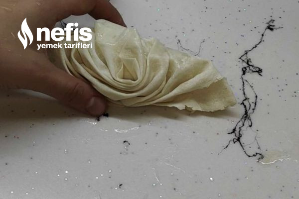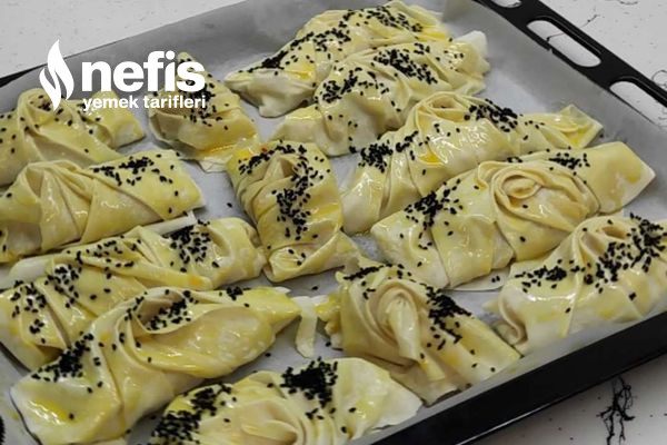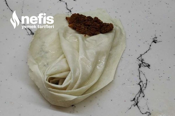- Uçlardan birleştirip kenarları birbiri üzerine gelecek formda düzeltip harcımızı yerleştirip sarıyoruz.