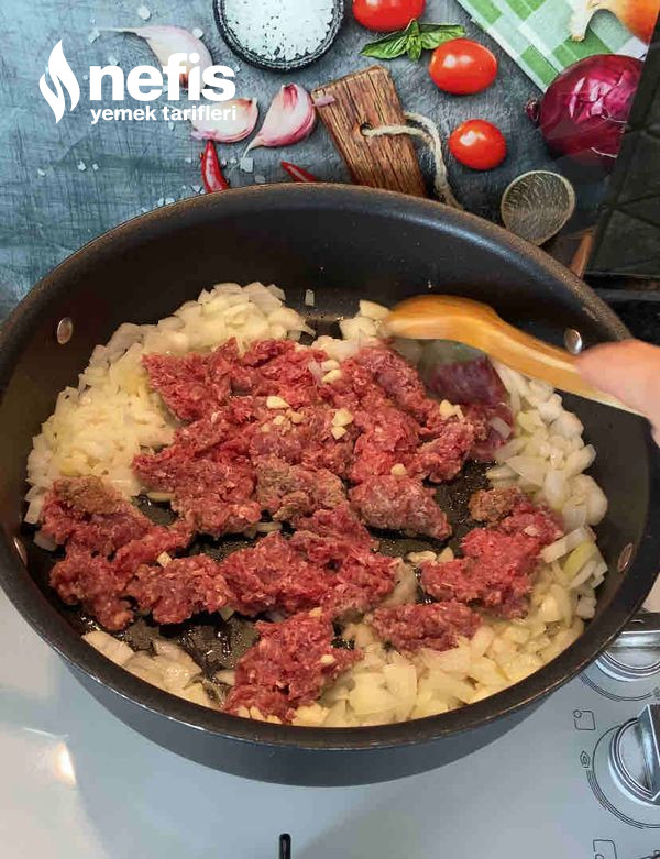 - Kavrulan kıymaya salçası, baharatları eklenir hepsi bir karıştırılıp tencereye düzelterek yayılır.