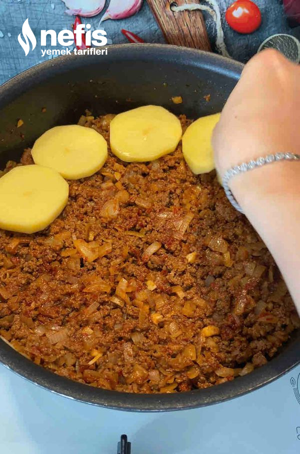 - Bundan sonra karıştırma süreci yapmadan üzerine halka halinde doğranmış patatesler dizilir.
