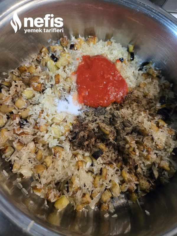 - Kavrulan soğana pirinçleri ek edip 5-6 dakika kadar kavuralım üzerine kızaran patlıcanları domates sos ve baharatları ek edelim bir iki defa karıştırıp suyunu ekleyelim.