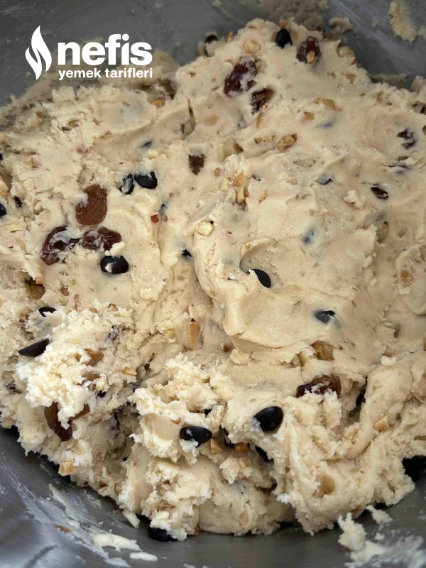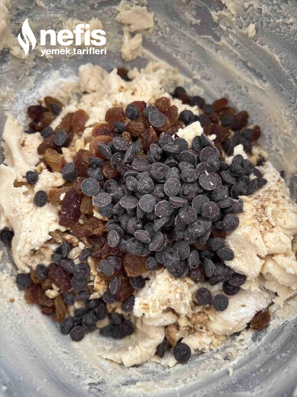 - Ceviziçi, kuru üzüm ve danla çikolatayı da ekleyip hamuru biraz daha yoğuralım.