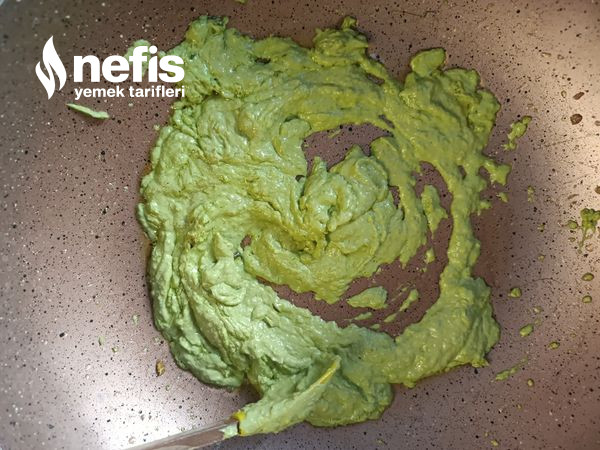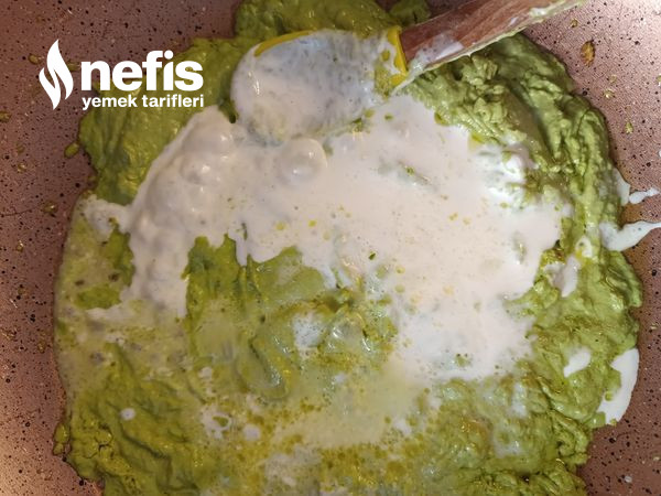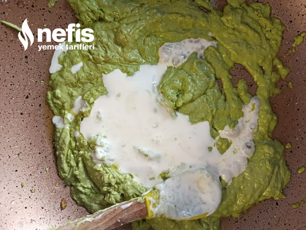 - Bir tavaya daha evvelce yapmış olduğumuz pesto sosumuzu alalım 2 yemek kaşığı kremayı ve tuzu ekleyelim.