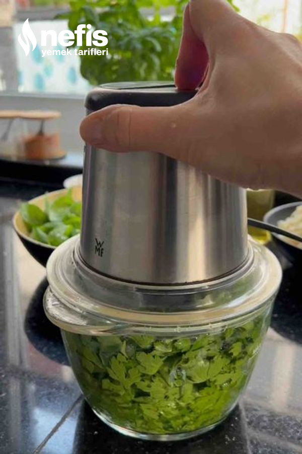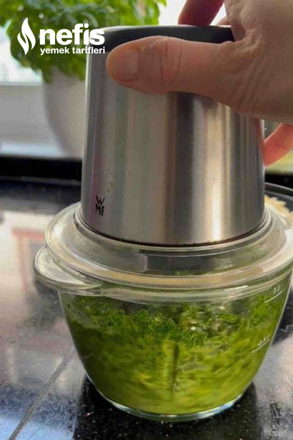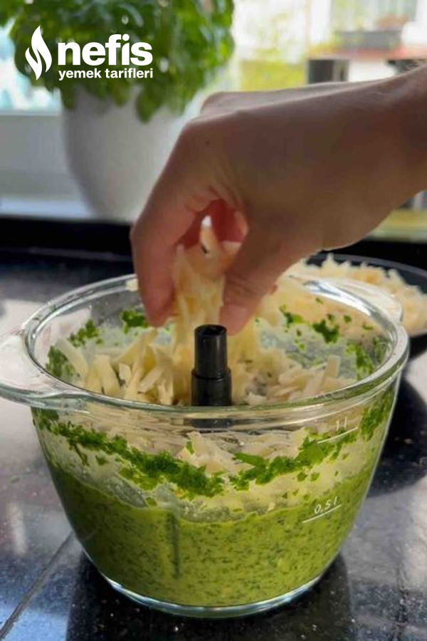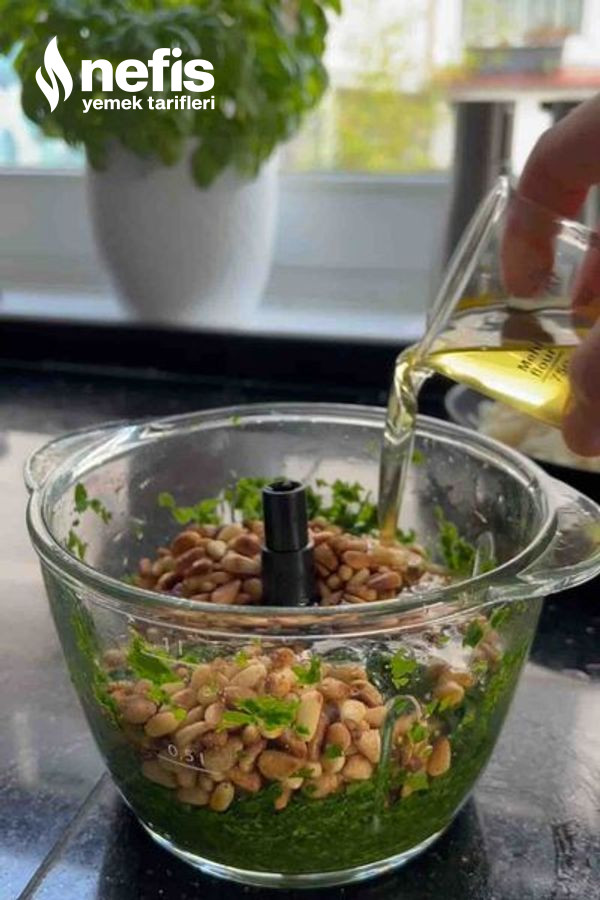 - Blender’a fesleğen, maydanoz, kavrulmuş çam fıstığı, zeytinyağı, sarımsak, taze rendelenmiş parmesan ve tuzu ekleyip kremamsı kıvam alıncaya kadar çekin.