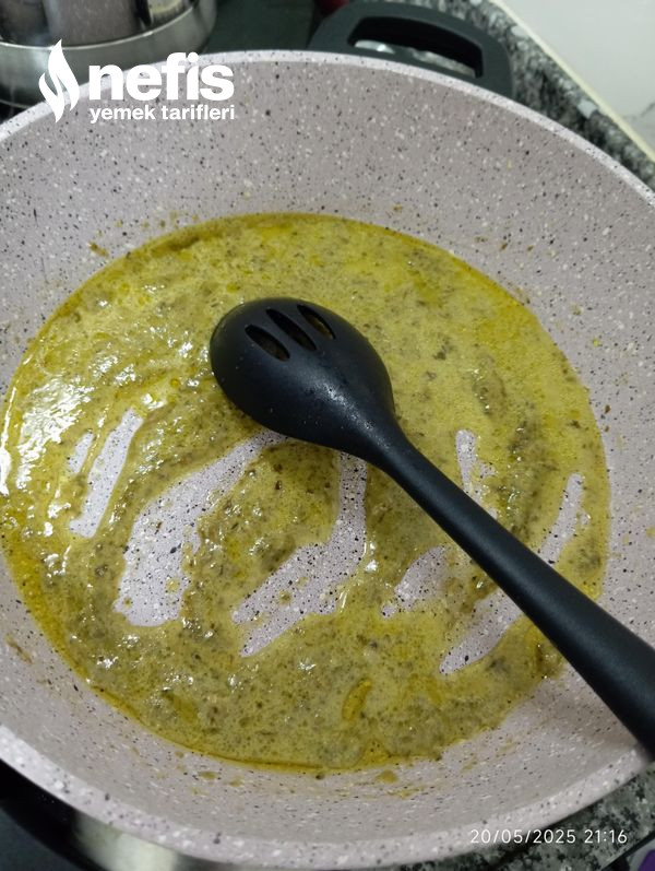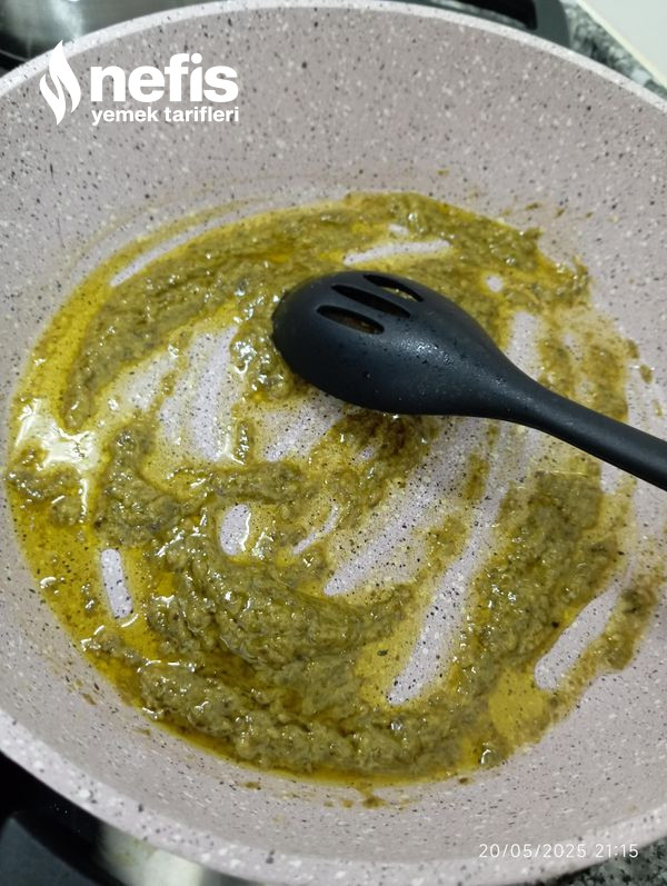 - Tencereye sıvı yağ ve pesto sosu alıp orta ateşte karıştıralım.