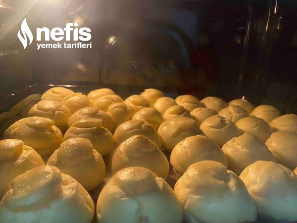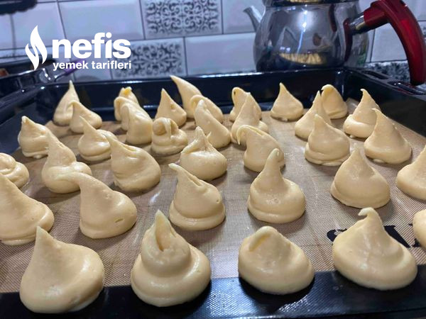 - Hamur sıkma torbasına doldurularak, pişirme kağıdı serilmiş fırın tepsisine aşikâr aralıklarla,istenilen büyüklükte yuvarlak olacak biçimde sıkılır (eğer sıkma torbası yoksa iki kaşık yardımıyla da bu süreç yapılabilir).