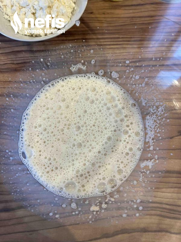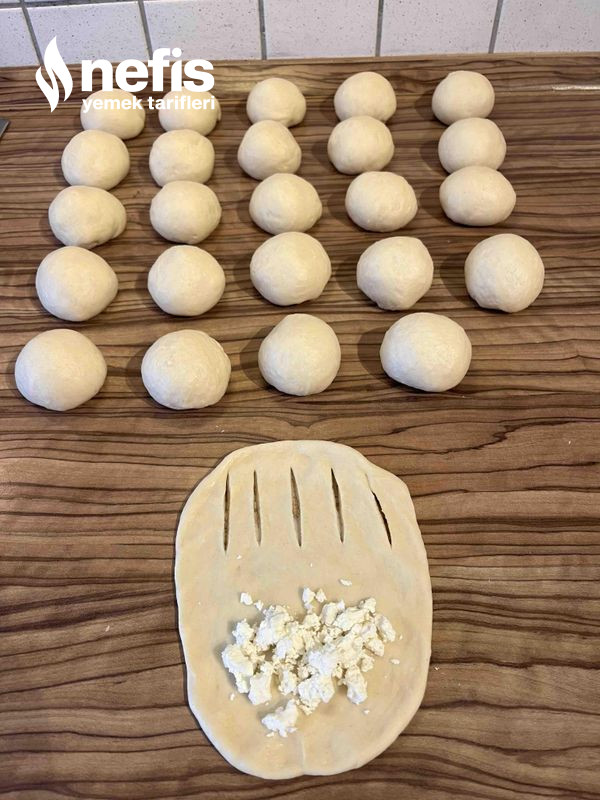 6. Bezelerimizi limon büyüklüğünde yapalım ve merdane yardımıyla açıp önlerine bıçak ile çizik atıp peynir yerleştirip saralım.